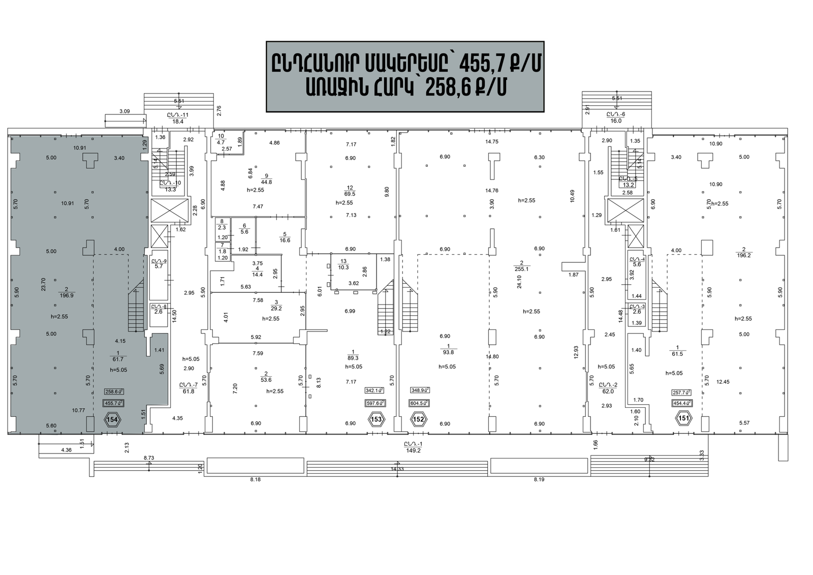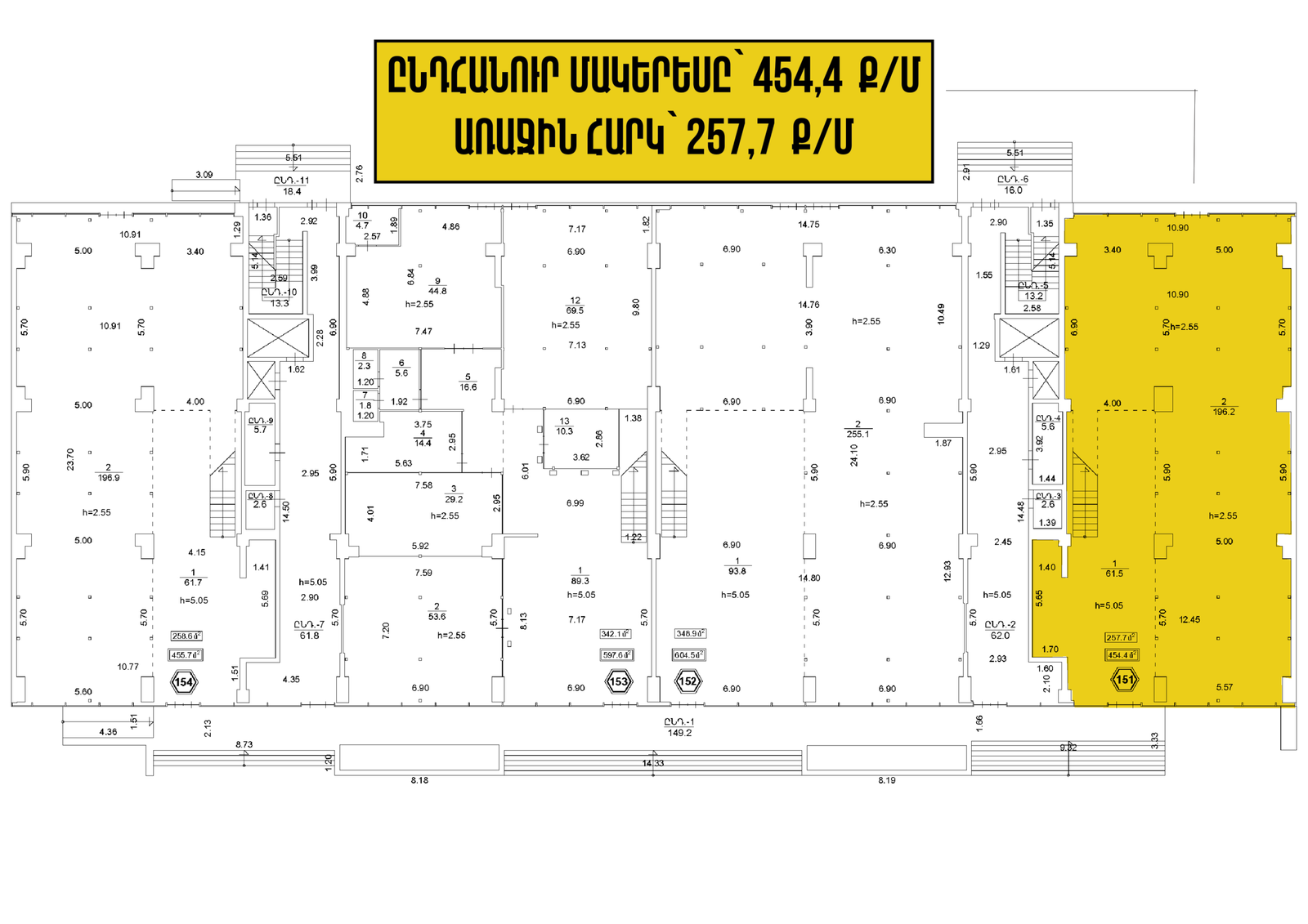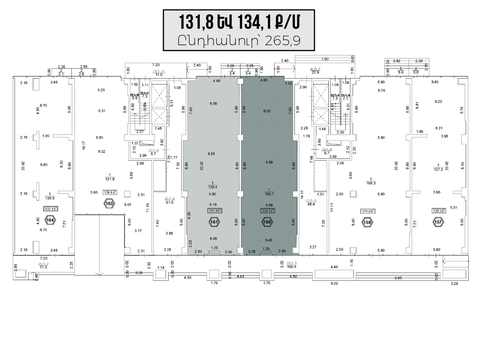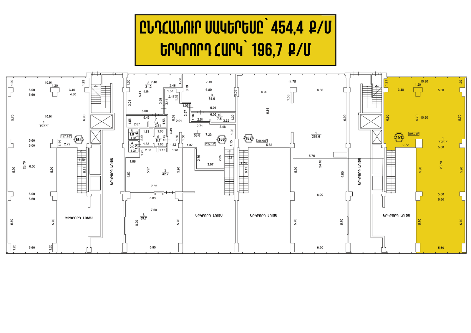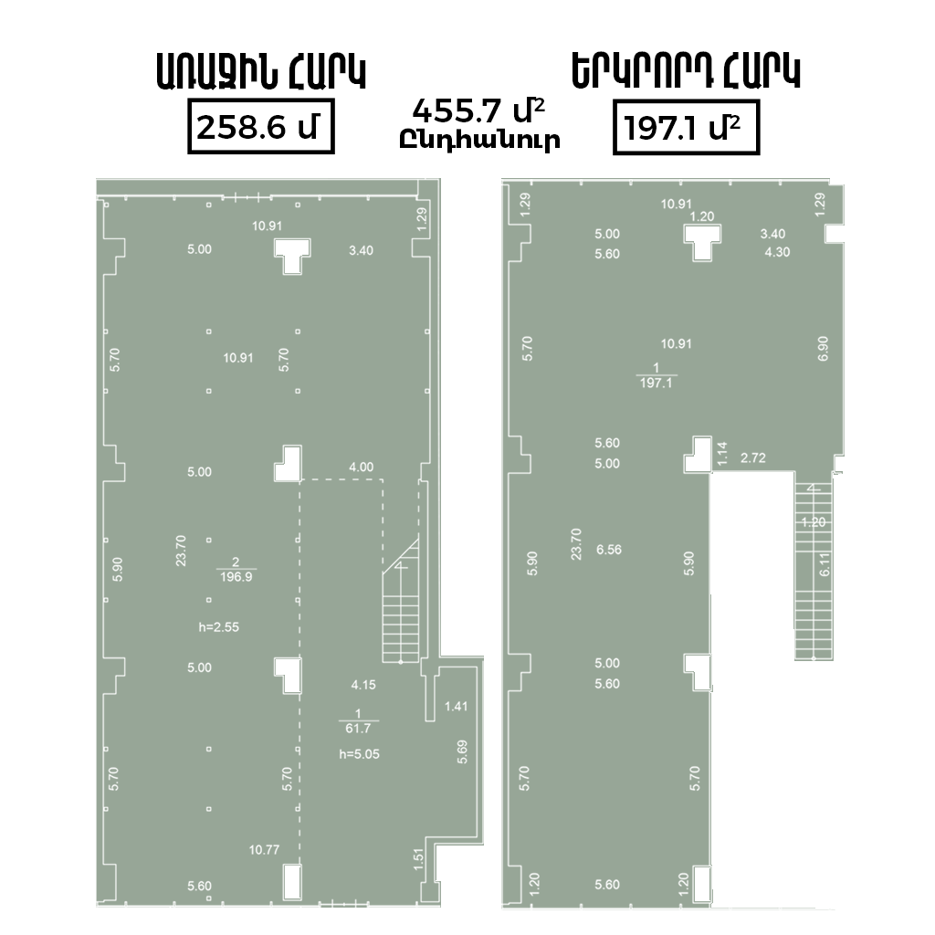 130-ից մինչև 600 ք/մ մակերեսով հասարակական տարածքներում, հնարավորություն կա կառուցելու երկրորդ հարկ, քանի որ առաստաղները 6 մետր բարձրության են։