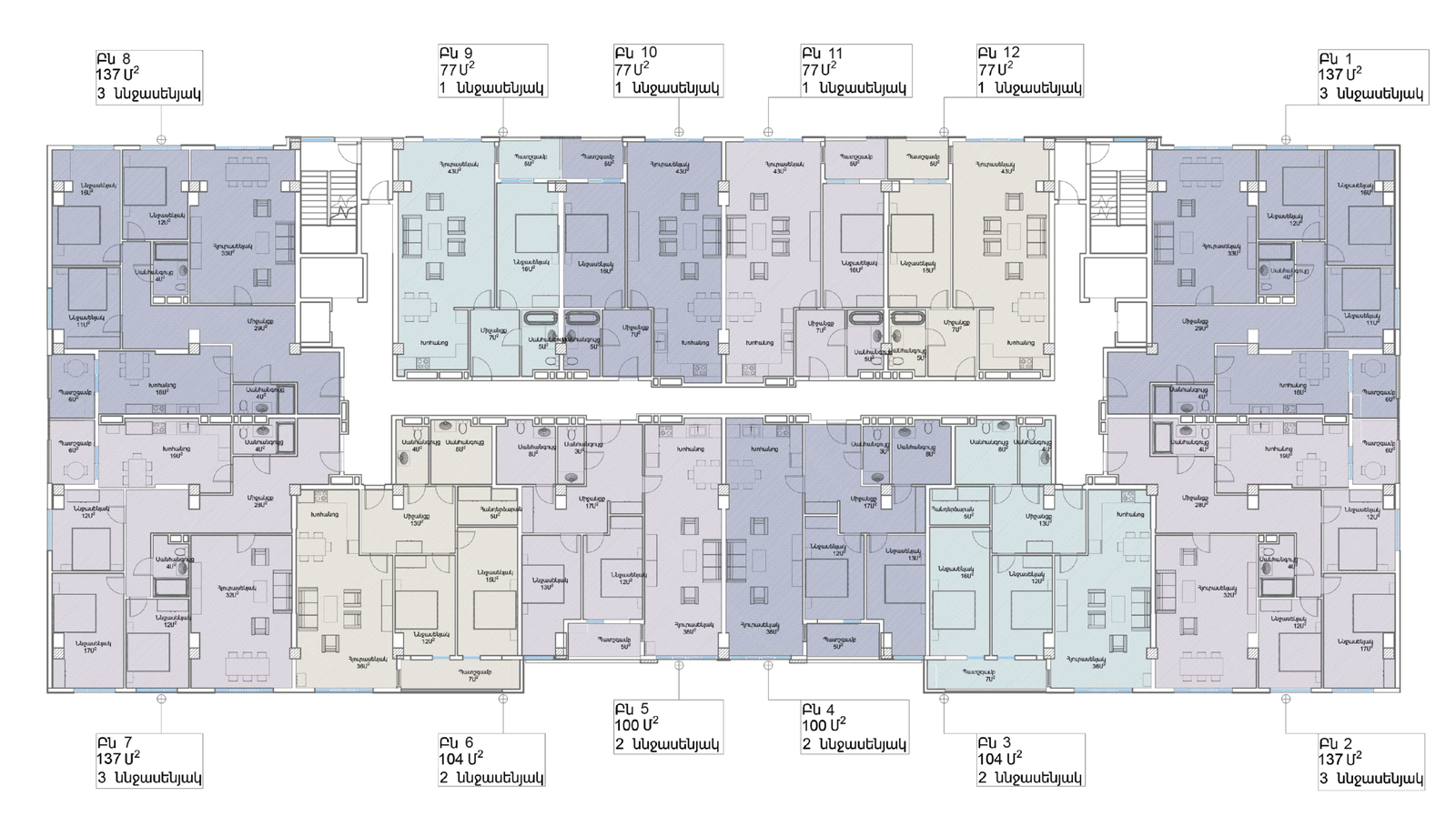 • 5–10-րդ հարկերում ներկայացված են բնակարաններ՝ 28.2 – 200.8 ք․մ․ մակերեսով։